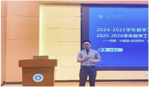 陈春发副校长总结了本学期教学工作,感谢全体教师努力协作圆满完成2025年教育教学审核评估工作,肯定了各专业在AI赋能教育教学改革先行先试方面做出的成绩,发布了《构建“AI赋能·质效双升”教育新生态》战略倡议,部署三大攻坚任务。